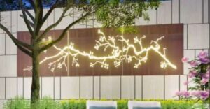 innovative fusion of landscape and lighting. Built with a weathering steel base, its branch patterns are precisely cut via laser. When the built-in lights are turned on at night, the golden veins of the branches cast warm, flowing light and shadow, as if freezing the vitality of nature onto the building facade.